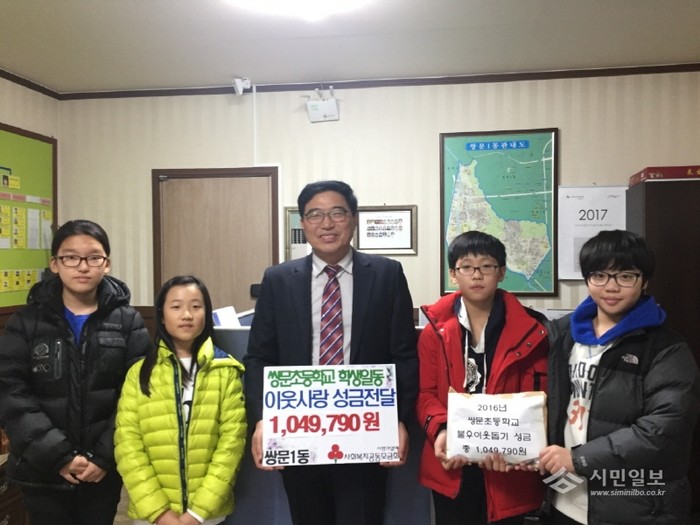 최근 서울 도봉구 쌍문초등학교 학생회 임원진이 쌍문1동 주민센터를 찾아 전교생 900여명이 동참해 모은 '이웃돕기 성금' 104만9790원을 전달했다. 사진은 관계자들이 기념촬영하는 모습.(사진제공=도봉구청)