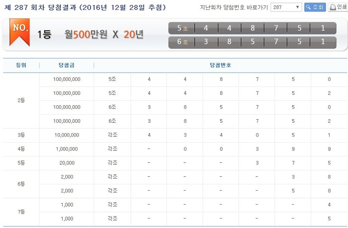 한편 연금복권 287회 당첨번호는 5조448751번, 6조385751번이다.