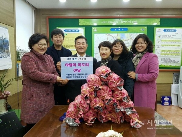 지난 29일 경기 수원시 권선구 구운동에서는 자원봉사 상담창구 근무자와 주민들이 털실로 직접 떠서 만든 목도리를 구운청룡 봉사단이 만든 반찬과 함께 지역 홀로노인 등 27가구에 전달했다. 사진은 관계자들이 기념촬영하는 모습.(사진제공=권선구청)