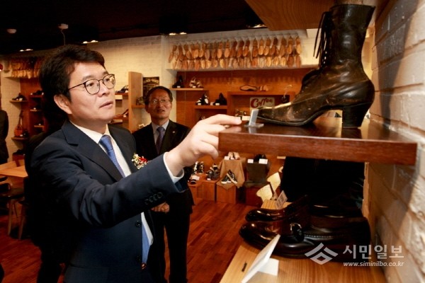 | ▲ 성동지역경제혁신센터 개관식에 참석한 정원오 성동구청장이 갤러리에 전시된 수제화를 살펴보고 있다.(사진제공=성동구청) | ||