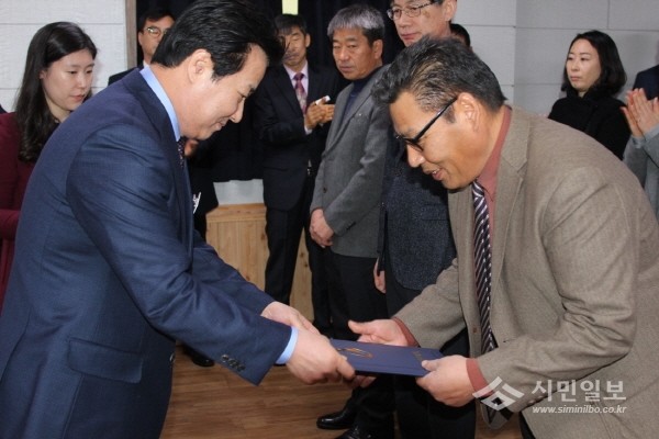 지난 28일 충남 아산교육지원청은 특수교육지원센터에서 1일자 인사발령에 따른 아산시 지역내 전입 공무원 36명에 대한 사령장 교부식을 열었다. 사진은 김준표 교육장(왼쪽)이 전입 공무원에게 사령장을 교부하는 모습.(사진제공=아산교육지원청)