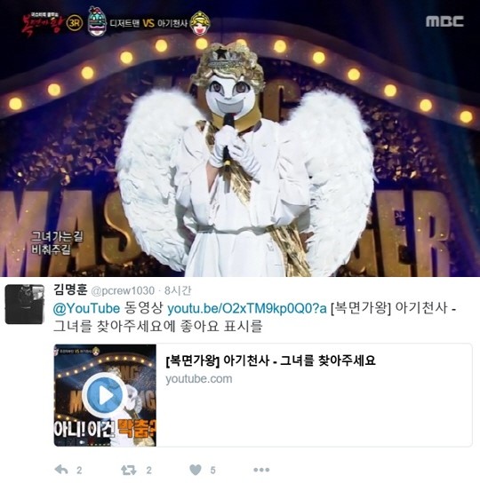 김명훈은 지난 1일 밤 자신의 트위터 계정에 "@YouTube 동영상 youtu.be/O2xTM9kp0Q0?a [복면가왕] 아기천사 - 그녀를 찾아주세요에 좋아요 표시를"이라는 흔적을 남겼다.