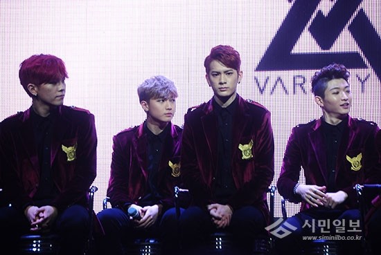 이날 쇼케이스장에서 바시티 멤버들이 앨범에 대한 소개를 하며 진지한 얼굴로 인터뷰에 임하고 있다.