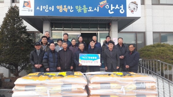 지난 30일 경기 안성시 서운면에 위치한 KCC 안성공장에서는 직원들이 직접 모금한 성금으로 이웃돕기 물품(백미 500만원 상당)과 장학금(90만원)을 서운면 이장단에게 전달했다. 사진은 관계자들이 기념촬영하는 모습.(사진제공=안성시청)