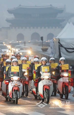 2일 오전 서울 광화문 거리에서 오토바이를 탄 집배원들이 안전하고 정확한 우편물 배달을 다짐하는 발대식을 한 뒤 거리 퍼레이드를 하고 있다.