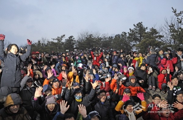 광진구는 지난 1일 오전 7시20분 아차산 해맞이 광장에서 '2017 아차산 해맞이 행사'를 개최했다. 사진은 이날 해맞이 축제에 참여한 시민들이 만세삼창을 하는 모습.(사진제공=광진구청)