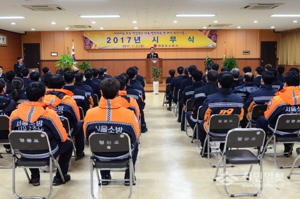 서울 영등포소방서는 지난 2일 소방서 4층 강당에서 각 과장, 팀장, 직원 등 100여명이 참석한 가운데 신년 시무식을 개최했다. 사진은 이귀홍 서장이 신년사를 하는 모습.(사진제공=영등포소방서)