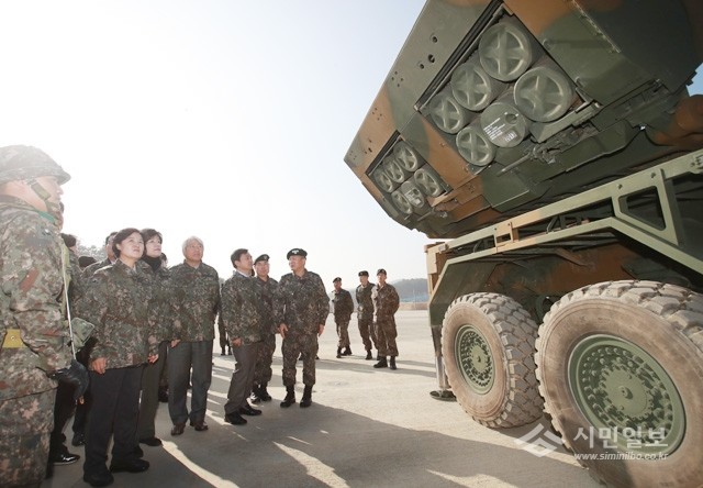 더불어민주당 추미애 대표가 3일 오후 경기도 파주의 한 포병부대를 방문해 다연장로켓인 ‘천무’ 장비를 살펴보고 있다.