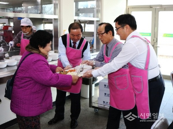 지난 3일 경기 연천군공무원직장협의회는 정유년 새해를 맞아 노인복지회관을 방문해 무료급식봉사활동을 펼쳤다. 사진은 급식봉사를 하고 있는 김규선 군수(왼쪽 두번째)와 회원들의 모습.(사진제공=연천군청)