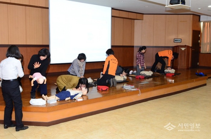 지난 3일 서울 영등포소방서는 소방서 4층 강당에서 방송통신대 유아교육학과 학생을 대상으로 '시민안전파수꾼 소방안전교육'을 실시했다. 사진은 참여자들이 심폐소생술 실습을 하는 모습.(사진제공=영등포소방서)