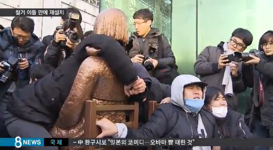 ‘평화의 소녀상’이 경기 동구 초량동에 있는 일본 영사관 앞에 지난해 12월 28일 기습 설치됐다. 하지만 경찰은 4시간만에 소녀상을 철거했고, 이에 따라 일부 시민들은 이를 제지하기 위해 나섰다.