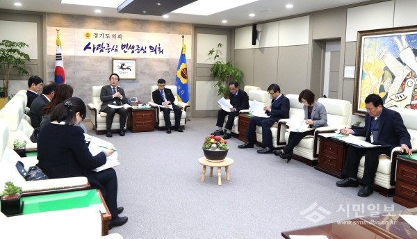 경기도의회 정기열 의장이 최근 도의회 의장접견실에서 경기도교육청·안양과천 교육지원청 관계자들을 만나 교내 시설개선비 및 학교지원 예산관련 문제 등 현장민원 21건에 대해 심도있게 논의했다. (사진제공=경기도의회)