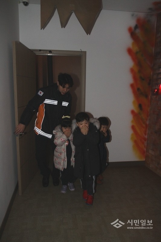 서울 은평소방서는 5일 오전 시민안전체험관을 방문한 지역내 GDA 영어유치원 원생과 지도교사 30명에 대해 어린이의 눈높이에 맞춘 '화재예방 소방안전교육'을 실시했다. 사진은 어린이들이 열·연기 피난체험을 하는 모습.(사진제공=은평소방서)