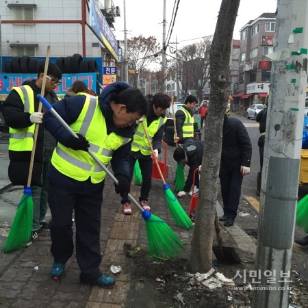 제종길 경기 안산시장(맨 앞)은 지난 4일 새벽 환경미화원, 선부2동 유관단체, 소상공인연합회, 상가번영회 등 시민 30명과 함께 선부2동에서 주요도로변 청소를 실시했다.(사진제공=안산시청)