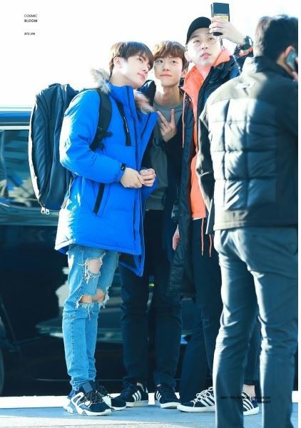 진은 공명,슬리피랑 셀카를 찍으며 인증샷을 남겼다. 이날 진은 블루컬러의 패딩에 디스트로이드 진, 블랙컬러의 백팩을 메고 한눈에 봐도 우월한 외모를 인증하고 있다.