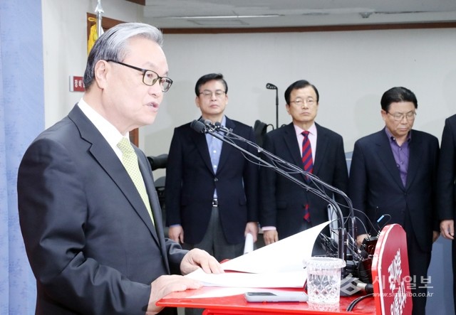 새누리당 인명진 비상대책위원장이 8일 오후 서울 여의도 당사에서 기자회견을 열고 “하루속히 이 일에 동참해주길 간곡히 호소한다”고 밝히고 있다. 뒷줄 왼쪽부터 정우택 원내대표, 이현재 정책위의장, 박맹우 사무총장이 배석해 있다.