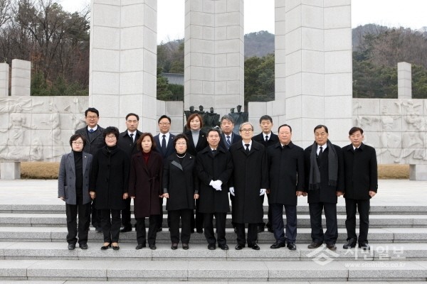 | ▲ 국립4.19민주묘지 참배에 나선 강북구의회 의원들의 모습. 앞서 열린 시무식에서 박문수 의장은 소통 의정을 강조했다. | ||