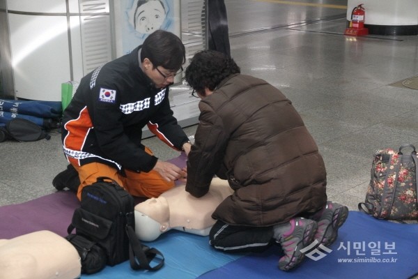 지난 6일 관악소방서는 서울대입구역에 마련된 예술무대에서 지하철 이용 시민을 대상으로 심폐소생술 등 소소심익히기 야외체험행사를 실시했다. 사진은 심폐소생술 교육이 진행중인 모습.(사진제공=관악소방서)
