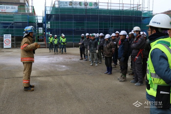 지난 5일 경기 하남소방서는 미사강변 더샵 센트럴포레 신축공사현장에서 '대형공사장 합동소방훈련'을 실시했다. 사진은 공사 관계인 소방안전교육이 진행 중인 모습.(사진제공=하남소방서)