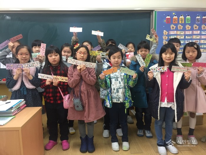 최근 경북 구미시 원호초등학교는 1~6학년 학생 43명이 참가한 가운데 '겨울방학 독서캠프'를 운영했다. 사진은 캠프에 참여한 학생들이 직접 만든 '독서명언 책갈피'를 들고 기념촬영을 하는 모습.(사진제공=구미교육지원청)