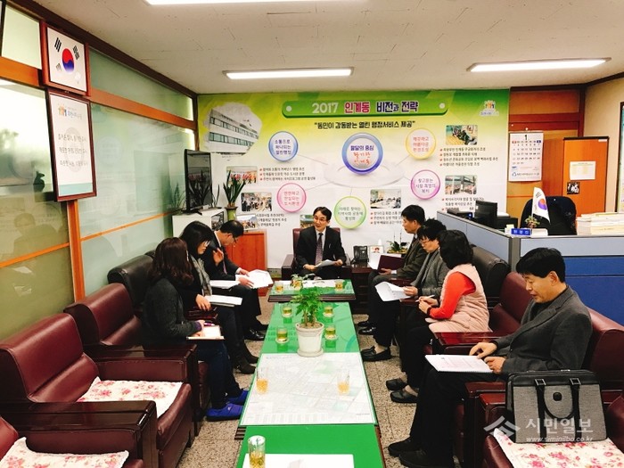 최근 김창범 수원시 팔달구청장이 인계동 행정복지센터를 첫 방문했다. 사진은 김 구청장(가운데)이 인계동 관계자들에게 새해 주요업무 및 현안사항을 청취하는 모습.(사진제공=팔달구청)