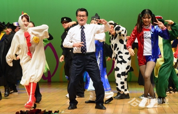 유종필 관악구청장(사진 가운데)이 최근 관악문화관·도서관 공연장에서 열린 '2017신년인사회'에 참석한 가운데 직원·주민 등과 함께 '붐바스틱 댄스'를 선보이고 있다. (사진제공=관악구청)