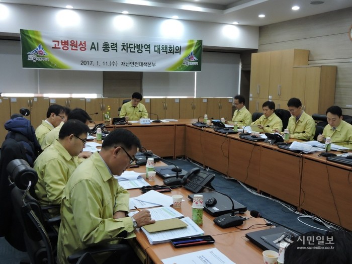 세종시가 11일 오전 조류 인플루엔자(AI) 추가 확산 방지와 조기종식을 위한 ‘총력 방역 대책회의’를 열었다. 사진은 이춘희 시장을 비롯한 시 관계자들이 AI 확산방지를 위한 대책을 논의하는 모습.(사진제공=세종시청)