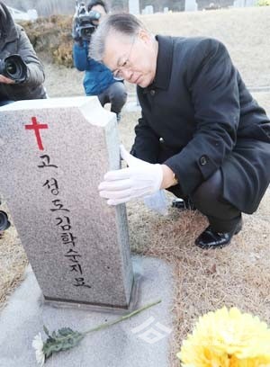 더불어민주당 문재인 전 대표가 11일 충남 천안시 망향의 동산에서 위안부 피해자 김학순 할머니 묘소를 찾아 헌화한 후 묘비를 살펴보고 있다.