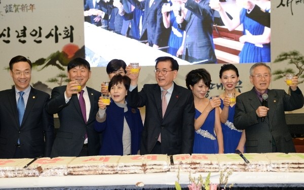 서울 동대문구는 지난 11일 구청 2층 강당에서 ‘2017 신년인사회’를 개최했다. 사진은 유덕열 구청장(오른쪽에서 네번째)이 신년인사회에 참석한 관계자들과 시루떡 커팅식에 이어 건배를 하고 있는 모습.(사진제공=동대문구청)