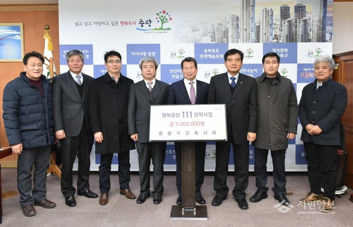 나진구 서울 중랑구청장(오른쪽에서 네 번째)이 지난 10일 오후 3시 구청장실에서 '중랑구 건축사회'로부터 '행복중랑 111 장학사업' 장학금 500만원을 전달받고 기념촬영을 하고 있다.(사진제공=중랑구청)