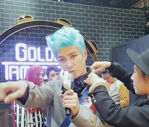심형탁은 탑처럼 파격적인 민트색 머리에 스모키 메이크업으로 눈길을 끈다.