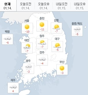 현재 서울은 영하 10도, 춘천은 영하 11도, 대전은 영하 7도, 부산 영하 3도, 제주도는 4도를 기록 중이다.