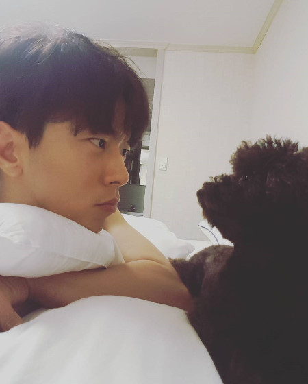 그는 공개된 사진 속에서 자신의 반려견 '칠봉이'와 서로를 마주보며 '눈싸움'을 하고 있다.