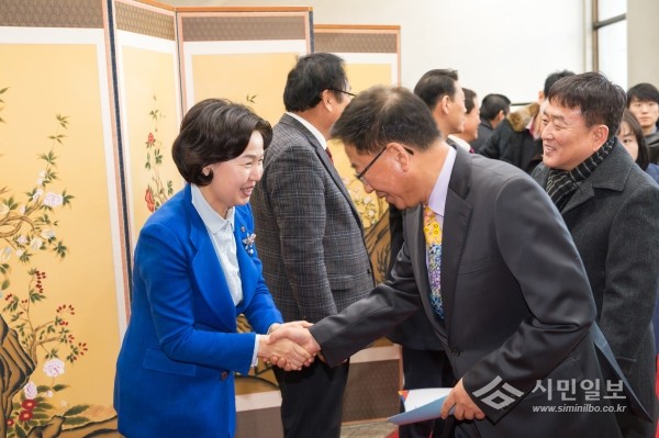 최근 양천구는 양천문화회관에서 김수영 구청장 등 1000여명의 각계 인사와 주민들이 참석한 가운데 ‘2017 양천구 신년인사회’를 개최했다. 사진은 김 구청장(왼쪽)이 행사 참가자와 인사하는 모습.(사진제공=양천구청)