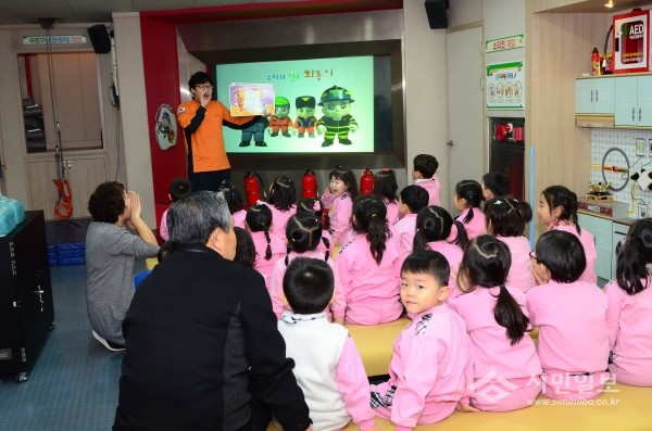 최근 서울 영등포소방서는 영등포동 소재 영일 어린이집에서 교사와 어린이들을 대상으로 소방안전교실을 운영했다. 사진은 어린이들이 화재발생시 행동요령에 대해 배우는 모습.(사진제공=영등포소방서)