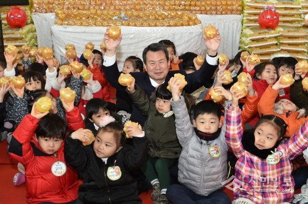 나진구 중랑구청장이 지난 11일 오전 10시30분 구청 1층에서 열린 민간어린이집연합회 ‘사랑의 돼지저금통 및 쌀 전달식’에서 민간어린이집 원아들과 함께 저금통을 들고 기념 촬영을 하고 있다.(사진제공=중랑구청)