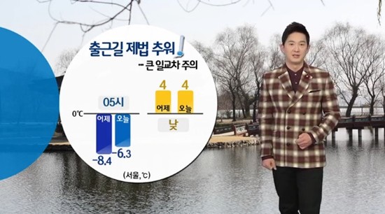 일부 중부내륙과 경북내륙에는 한파특보가 발효 중인 가운데, 이날은 아침 최저기온이 영하 10도 내외로 떨어지는 곳이 있겠으나, 낮부터 기온이 차차 오르면서 당분간 평년과 비슷한 분포를 보이겠다.