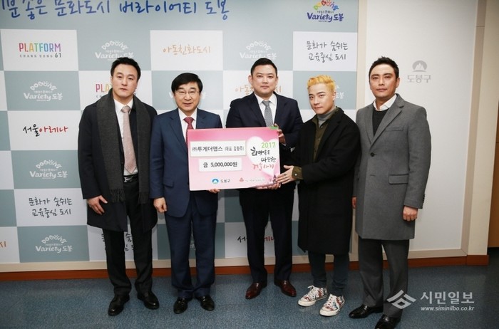 최근 서울 도봉구는 홍보대사인 래퍼 아웃사이더에게 ‘2017년 따뜻한 겨울나기 성금’으로 500만원을 기탁받았다. 사진은 이동진 구청장(왼쪽에서 두 번째)과 아웃사이더(오른쪽에서 두 번째)가 기탁식 후 기념촬영을 하는 모습.(사진제공=도봉구청)