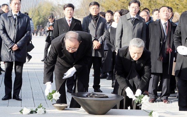 반기문 전 유엔(UN) 사무총장 내외가 17일 경남 김해시 봉하마을 노무현 전 대통령 묘역을 참배하고 있다.