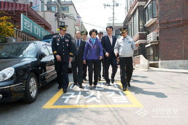 | ▲ 경찰 등 지역치안관계자들과 함께 새로 조성된 여성안심귀갓길을 살펴보는 김수영 양천구청장(가운데). | ||