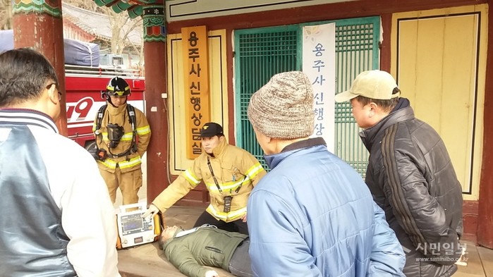 지난 17일 경기 화성소방서는 용주사(화성시 송산동)에서 '겨울철 전통사찰 소방 합동훈련'을 실시했다고 밝혔다. 사진은 소방관이 응급환자 응급처리 요령에 대해 설명하는 모습.(사진제공=화성소방서)