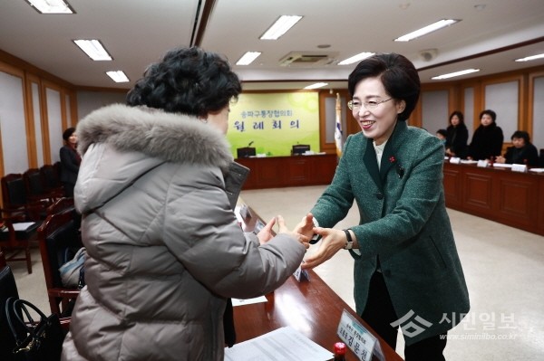 지난 18일 서울 송파구청 기획상황실에서 27명의 각동 통장이 참여한 가운데 ‘통장협의회 1월 월례회의’가 진행됐다. 사진은 박춘희 구청장(오른쪽)이 통장들의 손을 붙잡으며 인사하고 있는 모습.(사진제공=송파구청)