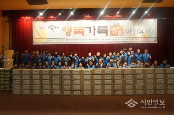 지난 18일 도봉구 민간자원봉사단협의회는 구청 2층 대강당에서 자원봉사자들과 함께 ‘설맞이 행복 가득함 상자’를 만들어 저소득 취약계층에 전달했다. 사진은 상자 전달에 앞서 기념사진 촬영을 하는 모습.(사진제공=도봉구청)