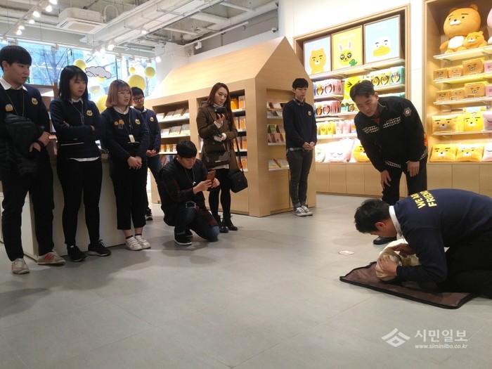 지난 18일 서울 마포소방서는 오전 지역내 카카오프렌즈 홍대점을 방문해 직원 30명을 대상으로 '소방안전교육'을 실시했다. 사진은 소방관이 심폐소생술 교육을 진행하는 모습.(사진제공=마포소방서)