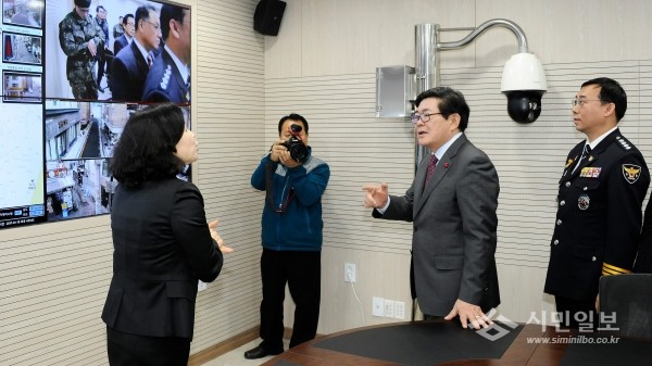 서울 광진구는 19일 신속하고 체계적인 방법체계를 구축해 각종 사건사고와 재난 피해를 최소화하기 위한 ‘CCTV통합관제센터’ 개소식을 개최했다. 사진은 개소식 이후 김기동 구청장(오른쪽 두번째)이 센터 시설 내부를 둘러보는 모습.(사진제공=광진구청)