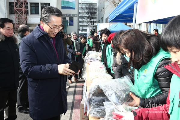 | ▲ 지난해 열린 설맞이 직거래 장터에서 물건을 구입하고 있는 김영종 구청장의 모습. | ||