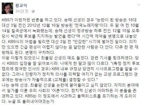 한편 황교익은 앞서 SNS를 통해 과거 송해가 지난 대선 당시 공개적으로 박근혜 후보를 지지하고도 '전국노래자랑'에 계속해서 출연했던 사례를 들며 자신이 받은 KBS1 교양프로그램 '아침마당' 출연 취소 통보에 대한 억울함을 밝혔다.