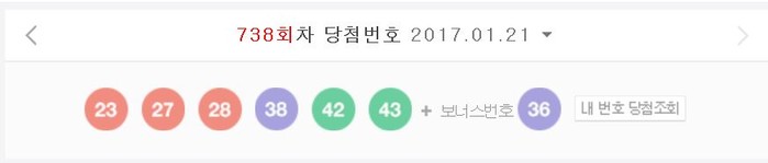 복권 추첨 1등 당첨번호는 '28, 27, 43, 38, 23, 42'번이다. 2등 보너스 번호는 '36'이다.