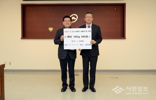 지난 23일 서울 동대문구청 기획상황실에서 열린 구사회복지협의회 훈훈한 설 보내기 사랑의 쌀 기탁식에 참석한 유덕열 구청장(왼쪽)이 신동욱 구사회복지협의회장으로부터 백미(10Kg) 500포를 기탁받고 기념촬영하고 있다.(사진제공=동대문구청)