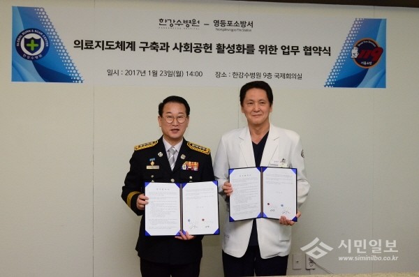 지난 23일 영등포소방서는 양평동 소재 한강수병원에서 119구급대원 의료지도체계 구축 및 상호 우호증진과 협력을 도모하기 위해 업무협약(MOU)을 체결했다. 사진은 이귀홍 서장(왼쪽)과 장영철 병원장이 기념촬영하는 모습.(사진제공=영등포소방서)